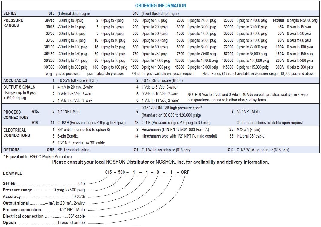 NOSHOK 615 Series are designed for heavy-duty applications requiring high accuracy and durability. Utilizing advanced diffused semiconductor and proven sputtered thin film sensor technology. They are stable, accurate, shock resistant and extremely durable. The durability is coupled with the mechanical integrity of the case, process connection, and wetted parts construction of corrosion-resistant stainless steel.