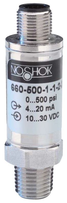 | 660-500-1-1-2-25 660-500-1-1-2-25/Asset/noshok-660-series-micro-size-pressure-transducer.JPG | Body Material N/A 316 Stainless Steel | Connection N/A 1/4" Male NPT | Electrical Connection N/A M12x1 (4-pin) | Output Signal N/A 4 mA to 20 mA, 2-wire | Operating Pressure N/A 0 to 500 psig |